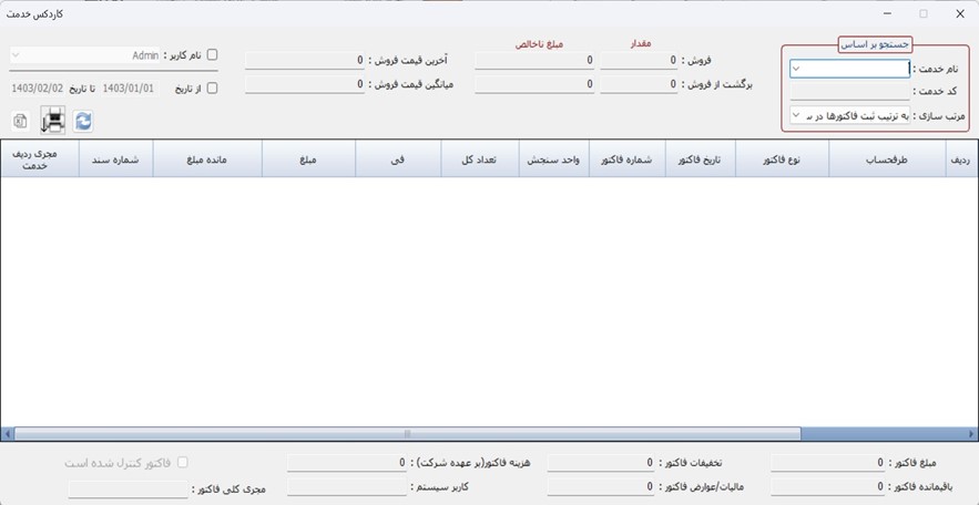 - گزارش ریز فروش خدمات بر اساس : خدمت – مجری خدمت – مشتری – گروه مشتری – استان و شهرستان مشتری